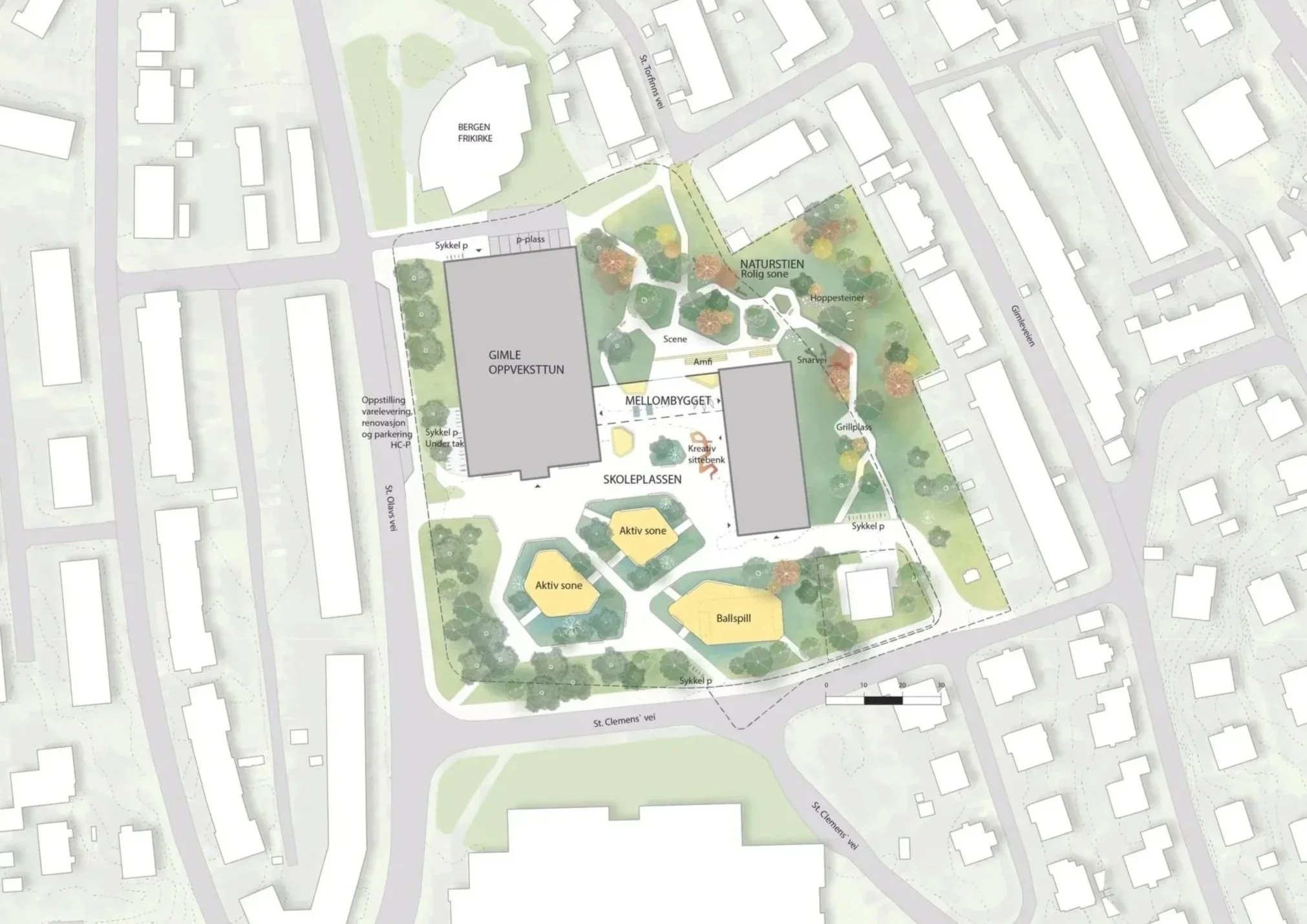 Gimle skole ligger i et lavpunkt i landskapet hvor det tidligere lå et vann og har som følge av dette store overvannsutfordringer. I tillegg mangler uteområdet aktiviteter og har stort behov for oppgradering. Med bakgrunn i dette har Østengen og Bergo gjennomført et skisseprosjekt som tar utgangspunkt i tomtas krevende overvannssituasjon med ambisjonen om å skape et forbildeprosjekt for blågrønne og aktive utearealer. Prosjektet utforsker innovative landskapsbaserte overvannsløsninger og kombinerer nedsenkede blågrønne arealer i faste dekker med konstruksjoner over våte sumpaktige grøntarealer. Vannet håndteres som en ressurs i skolegården hvor det fordrøyes, infiltreres og skaper attraktive uteområder som styrker både klimatilpasning og opplevelsesverdi.